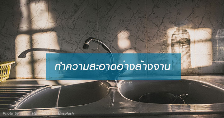 1. อันดับแรกเปิดน้ำให้อ่างเปียกทั่วถึงซะก่อน แล้วจึงเอาผงเบกกิ้งโซดาโรยทิ้งเอาไว้สักพัก จนเบกกิ้งโซดาจับตัวเป็นก้อน จากนั้นค่อยเอาน้ำสะอาดล้างออก
